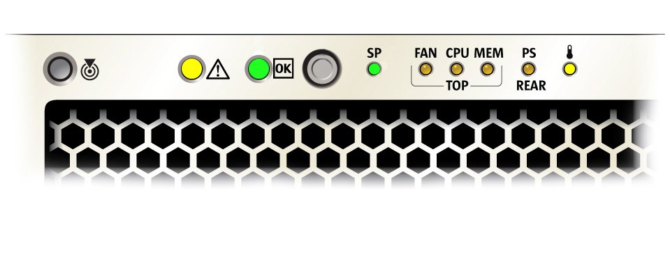 image:An illustration showing the front panel indicators lit for a failed service processor.