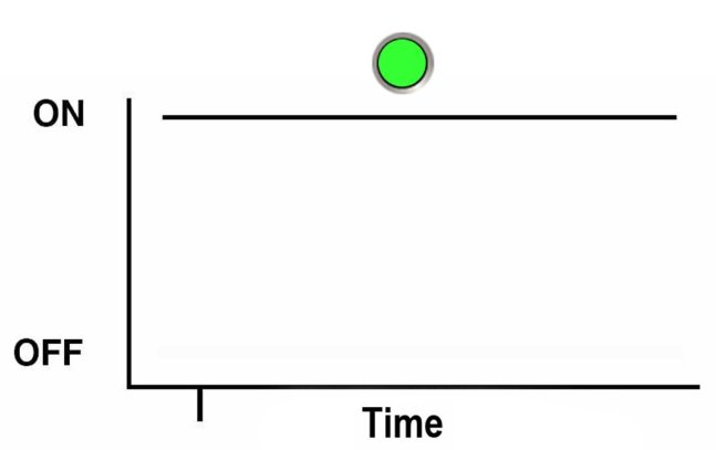 For the steady on state, an indicator is continually on (lit) and does not blink. This indicates a continuing condition, for example, an operational state (green) or a Service Action Required fault state (amber).