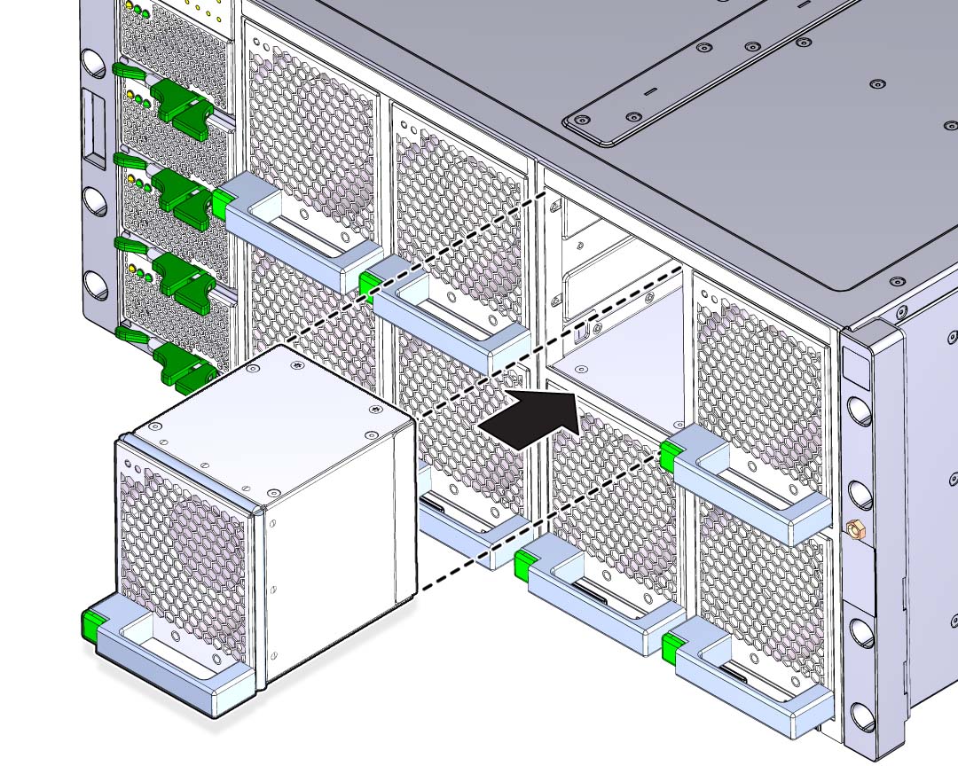 ![]() | Caution - Component damage. Do not apply excessive force when sliding the fan module into the server. Ensure that the connector on the CMOD and the connector on the fan module are aligned correctly. |