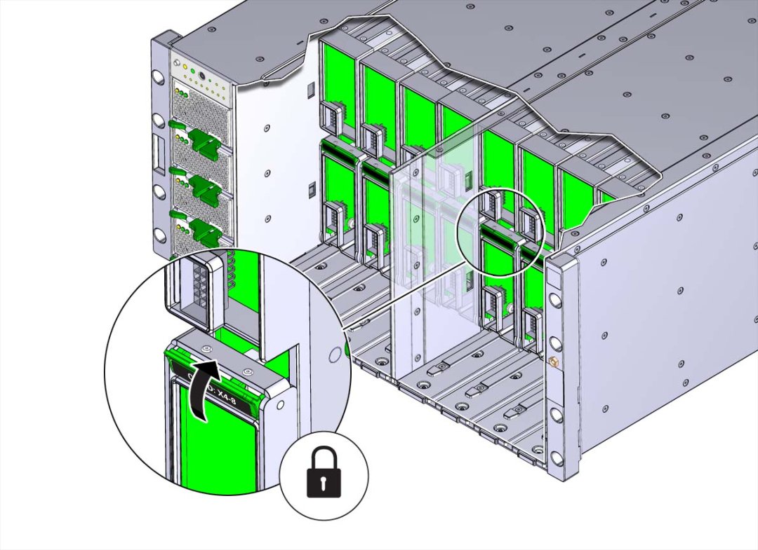 The action of rotating the lever upward draws the CMOD into the slot and engages the CMOD connector with the connector on the midplane.
