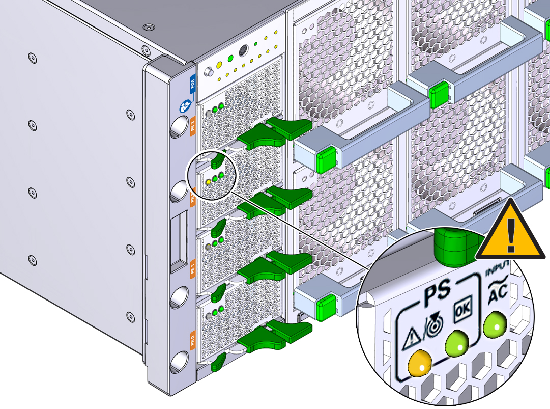 A power supply in a fault state has a lit amber-color Service Action Required indicator.