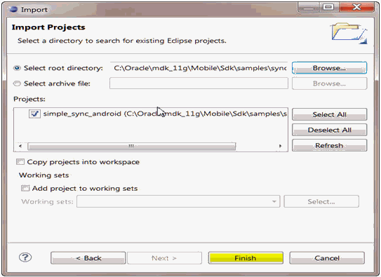 Click on "Browse…" button which should find the project files. Select the simple_sync_android project and click "Finish". The simple_sync_android project is now imported into your Eclipse Workspace.