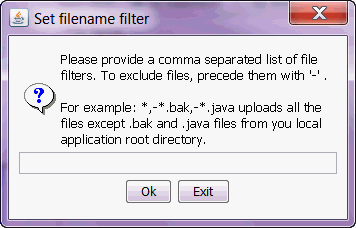 When you click the "Load" button, the "Input" dialog appears. You can use the "Input" dialog to create a comma-separated list of filters that either include or exclude application files from the upload process. To exclude a file, type a preceding minus sign (-) before the file name. For example, to load all files but exclude files with the .bak and .java suffixes, enter the following.