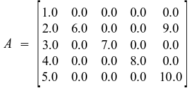 An unsymmetric sparse matrix does not have a(i, j) = a(j, i) for all i and j. The structure of the matrix does not have an apparent pattern. When solving an unsymmetric system, the entire matrix must be passed to the solver routines. An example of an unsymmetric matrix is shown below.