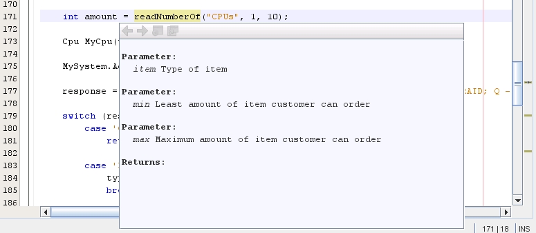 Click the readNumberOf class in the line you jumped to, and press Ctrl-Shift-Space to show the documentation you just added for the parameters.