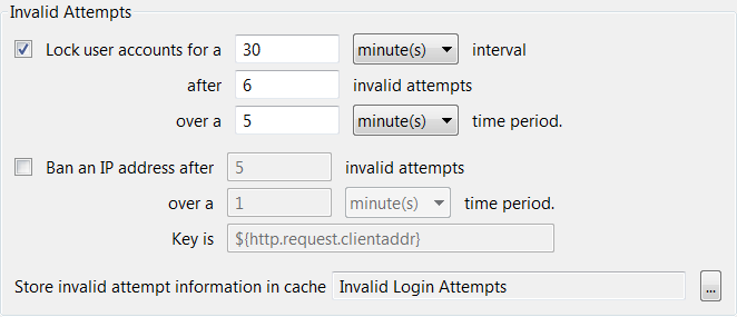 The Invalid Attempts section enables you to specify how to handle invalid attempts. You can choose to lock user accounts, ban IP addresses, or both, if a specified number of invalid attempts are made in a specified time period. The invalid attempt information is also stored in a cache.