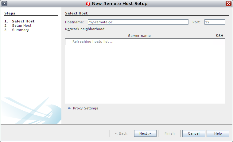 4. On the Select Host page in the New Remote Build Host wizard, type the system name of the host in the Hostname field or double-click an available host in the Network neighborhood list to select it and clicklick Next.