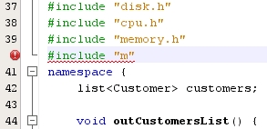 Backspace over the second quotation mark and complete the statement by typing odule.h”, and notice that error icon disappears as soon as the statement references an existing header file.
