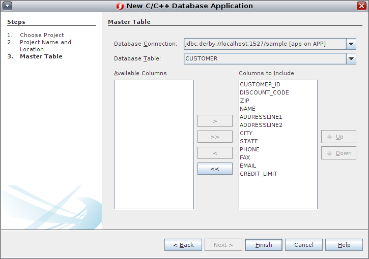 4. On the Master table page, select jdbc:derby://localhost:1527/sample from the Database Connection drop-down list. The IDE connects to the database.