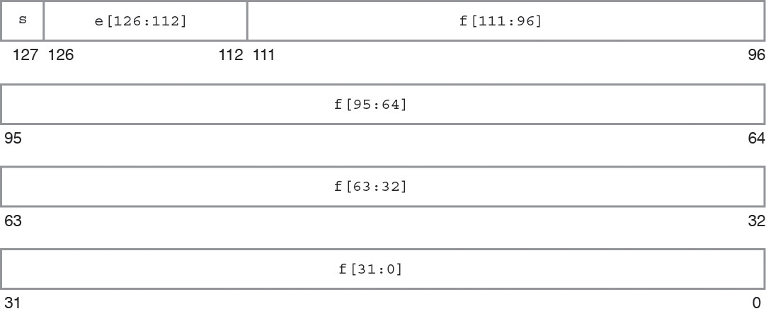 The following figure numbers the bits as though the four contiguous 32-bit words were one 128-bit word in which bits 0:111 store the fraction, f; bits 112:126 store the 15-bit biased exponent, e; and bit 127 stores the sign bit, s.