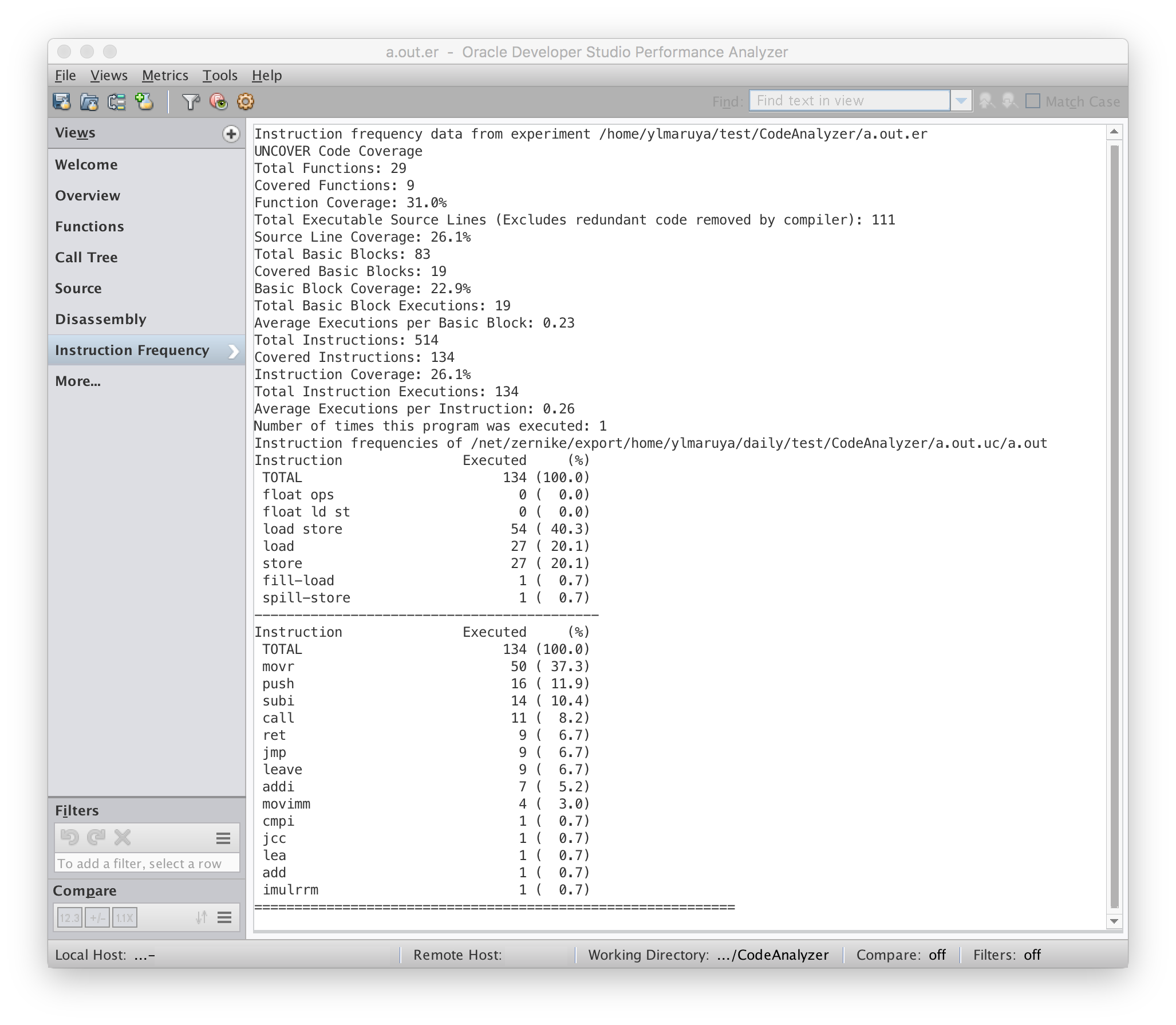 By default, when you run the uncover command on the coverage directory, the coverage report opens as an experiment in Oracle Developer Studio Performance Analyzer. This section describes Performance Analyzer interface that displays the coverage data.