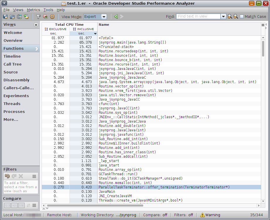 In Machine Mode, any user methods that are interpreted are not shown by name in the Functions view. The time spent in interpreted methods is aggregated into the Interpreter entry, which represents that part of the JVM that interpretively executes Java byte code.