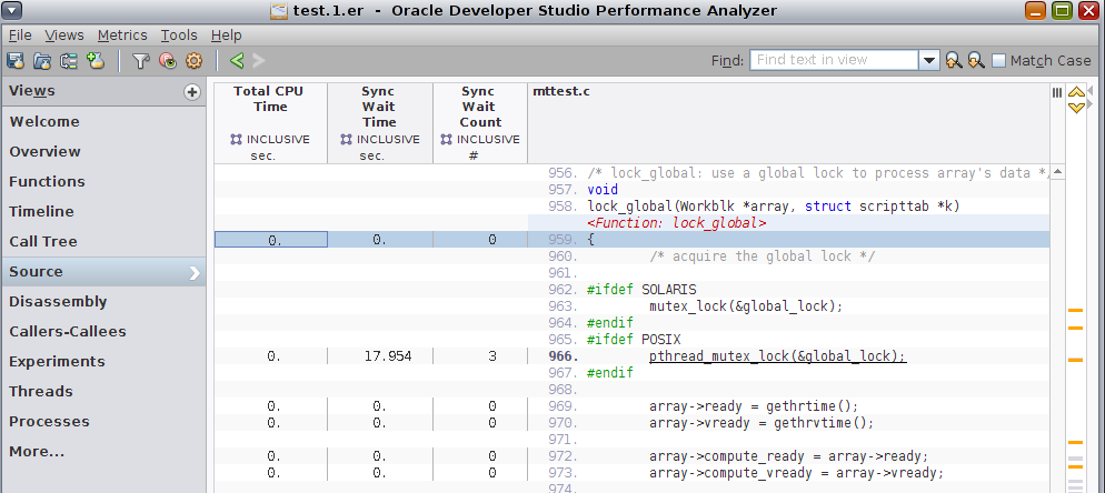 Look for the two functions lock_global() and lock_local(), and note that they show about the same amount of Attributed Total CPU time, but very different amounts of Attributed Sync Wait Time.