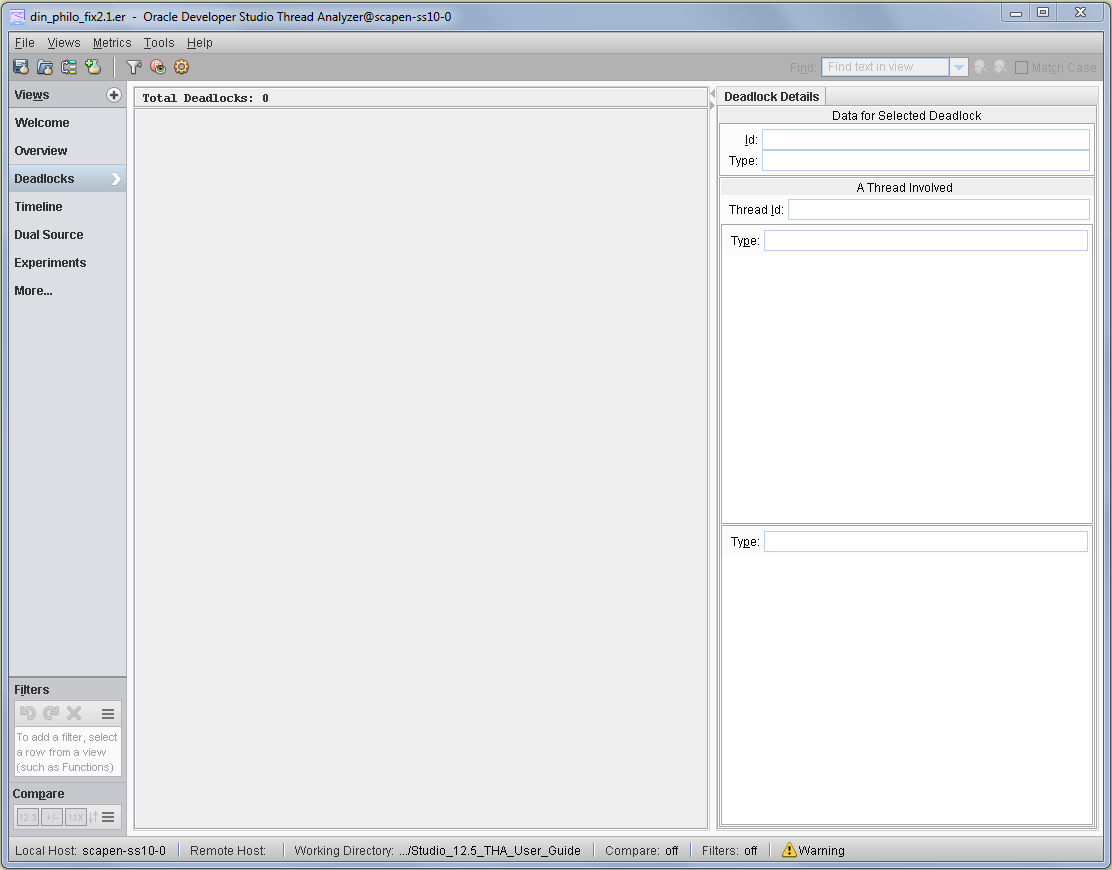 You will find that Thread Analyzer does not report any actual or potential deadlocks in the din_philo_fix2.1.er experiment, as the following figure shows.