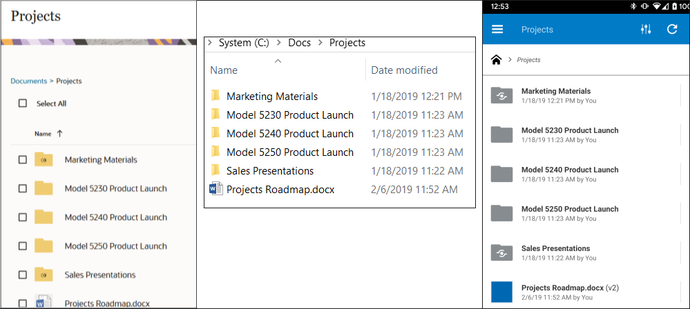 Oracle Content Management uygulamasında dosyalarınızla yerel bilgisayarınızdaki gibi çalışırsınız. Dosyalarınızı klasörlerde kolayca gruplayabilir ve içeriğinizi yönetmek için dosya ve klasörleri kopyalama, taşıma, yeniden adlandırma ve silme gibi çeşitli genel işlemleri gerçekleştirebilirsiniz. Buluttaki içeriğinizi yerel bilgisayarınızla senkronize ediyorsanız bilgisayarınızdaki sanal klasör yapınız çoğaltılır. Akıllı telefonunuzdaki veya tabletinizdeki mobil uygulamalarda da gösterilir.