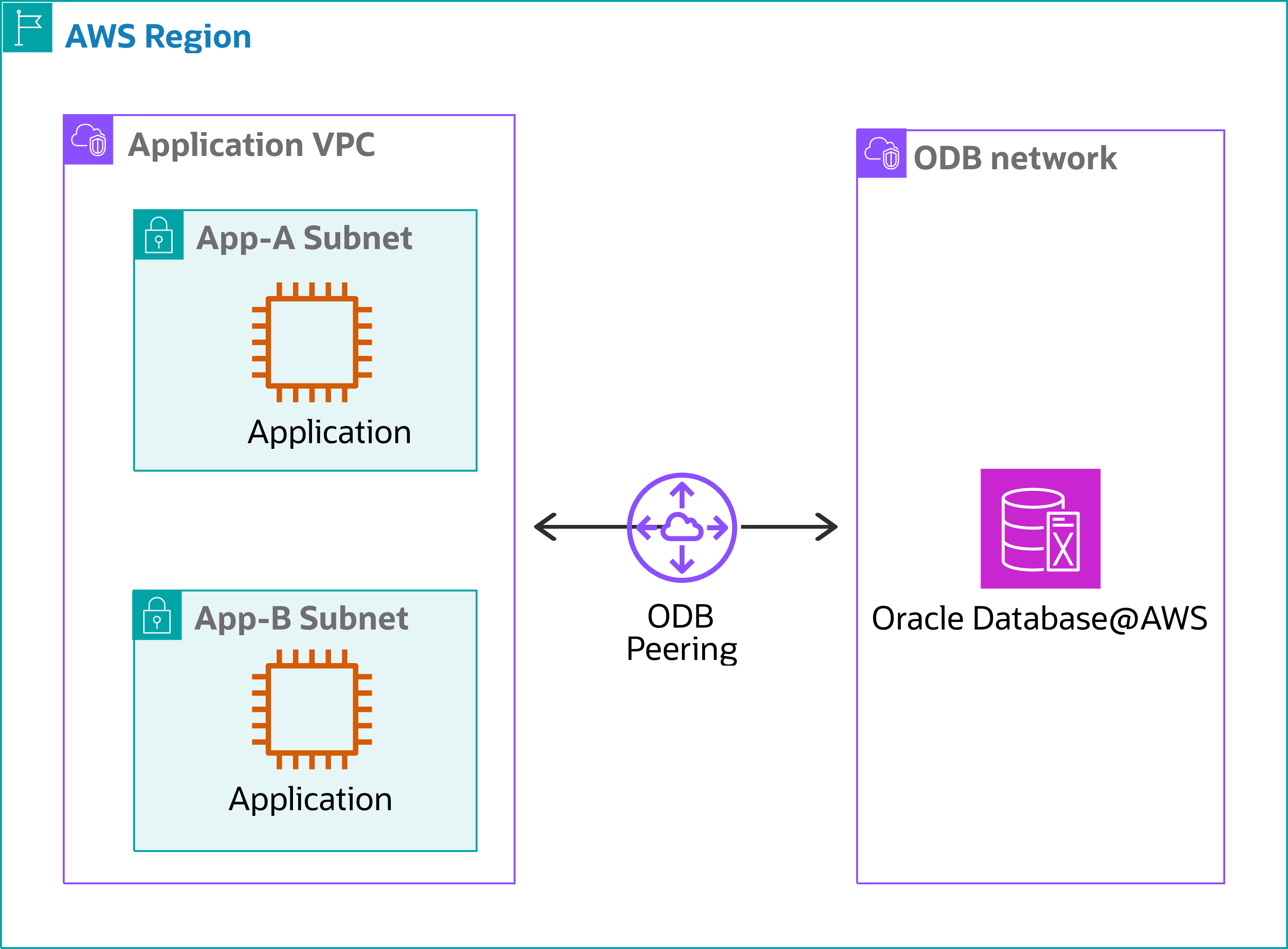 To maintain application isolation, separate the subnets for each application. The Application VPC connects to the ODB network using an ODB peering connection to the Oracle Database.