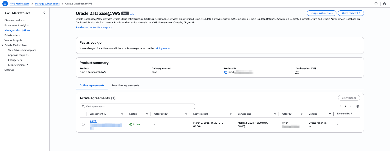 An accepted private offer creates an Oracle Database@AWS subscription in your buyer account.