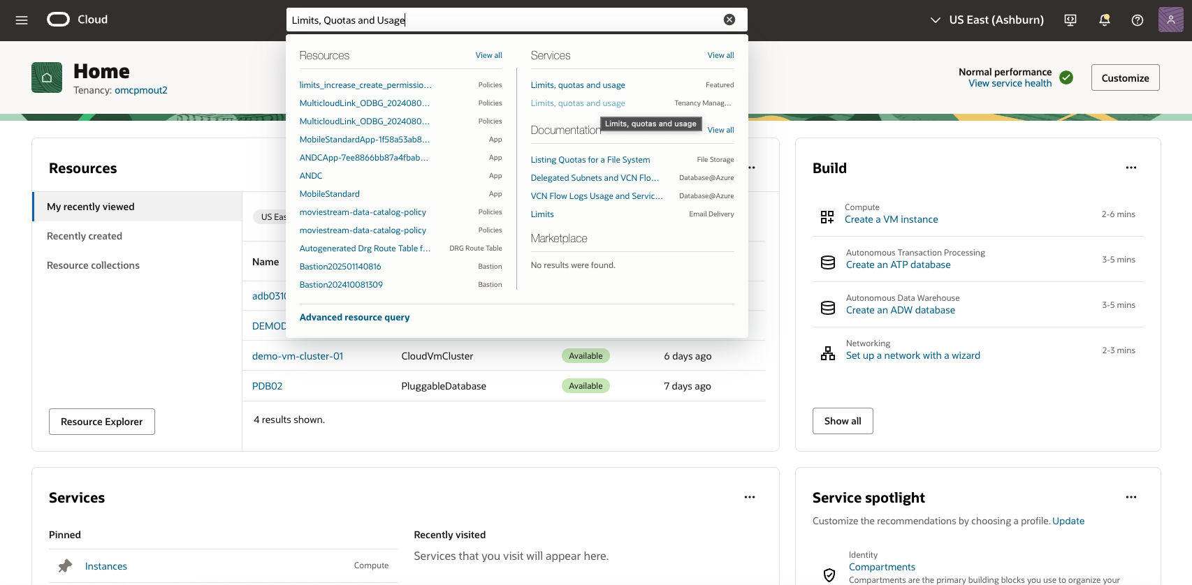 View Oracle Database@Google Cloud Service Limits in Google Cloud Portal