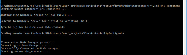 <Local Drive>:\Oracle\Middleware\user_projects\Foundation1\httpConfig\ohs\bin\startComponent.cmd ohs_component, and then enter the WebLogic Admin password.