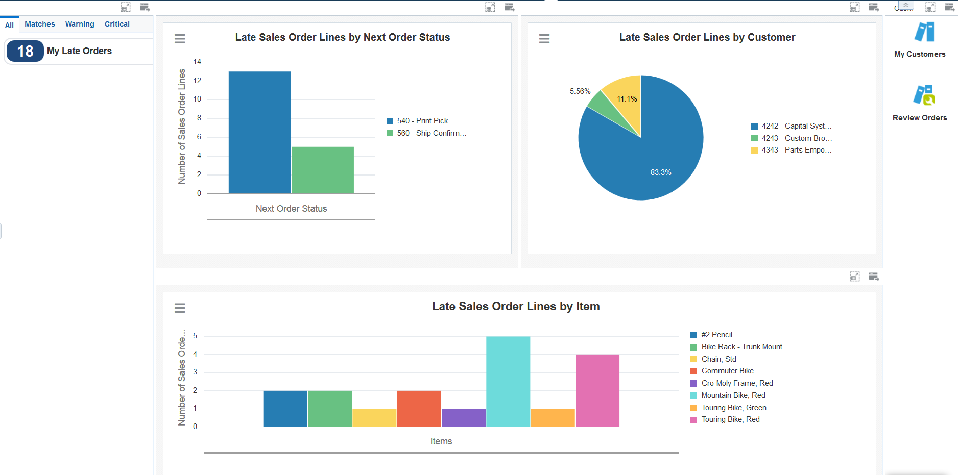 To access the UX One Late Orders page, log in to the EnterpriseOne system using the Customer Service Representative role. When you log in with this role, the system automatically displays the My Customers page. Click the Late Orders task on the springboard to access the Late Orders page.