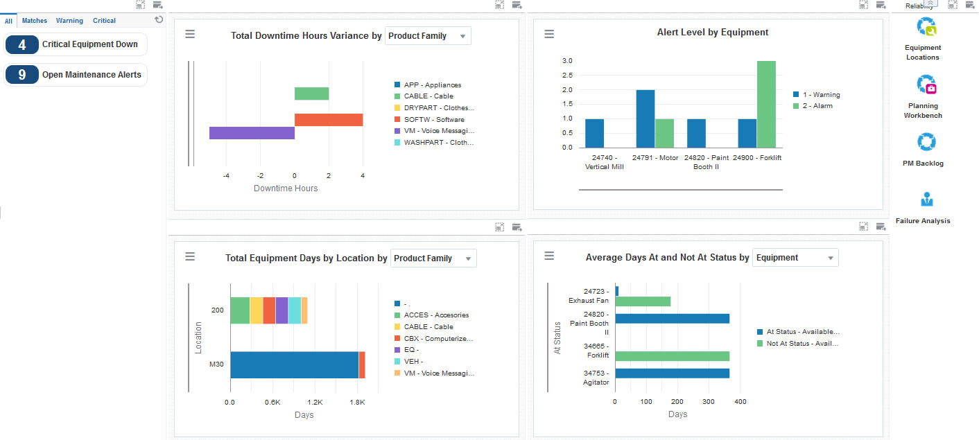 The Maint Team Reliability page (P13002X|W13002XD) enables maintenance managers to quickly gain insight into the reliability data of their assets and equipment.