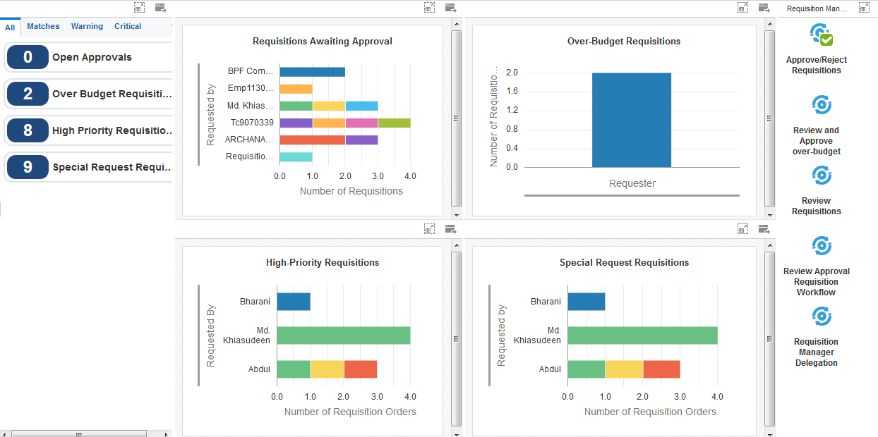 Use this chart to view the requisitions that are pending your approval. This chart is based on the Process Instance Left Outer Join - F98860, F98865, F98866 business view (V98860D). Note: To view the requisitions awaiting your approval, the query for this chart must contain the following criteria: