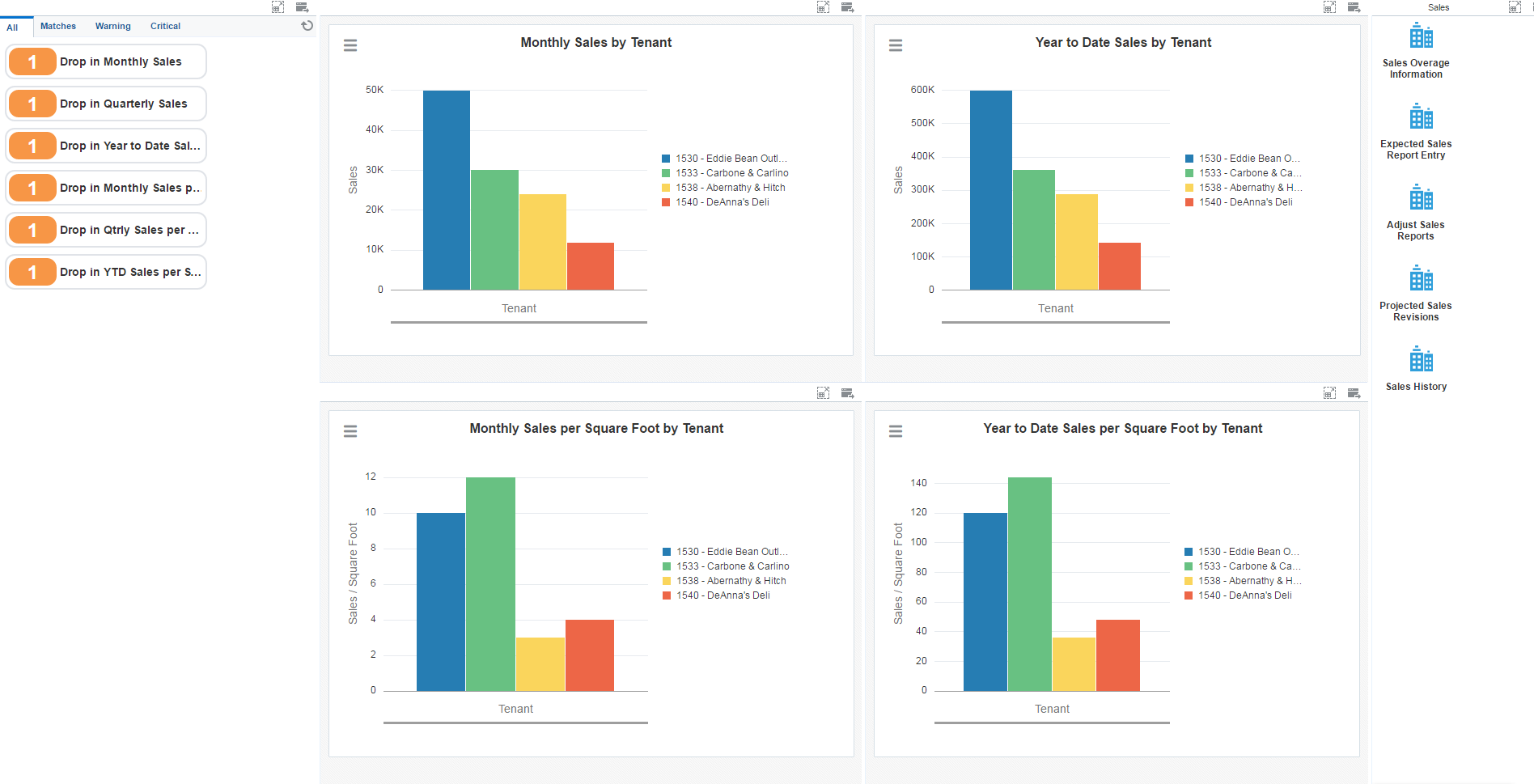 Use this chart to review monthly sales by various tenants. This chart is based on the Work With Sales Analysis program (P15043). |