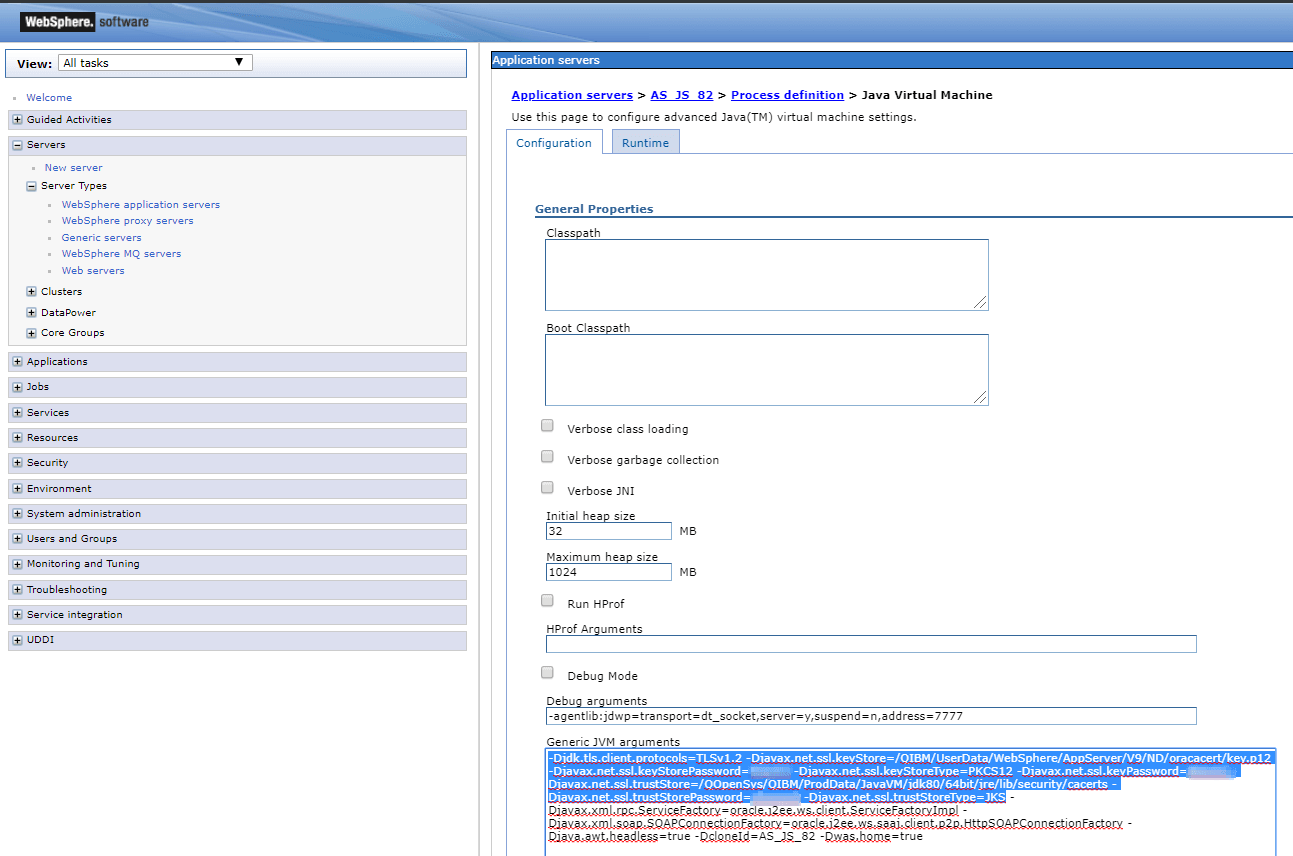 For the HTML server, navigate to Application servers - AS_JS_82 - Process definition - Java Virtual Machine, append the arguments as shown.