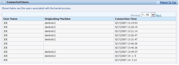 Security and CallObject kernel processes have active users associated with the process. The page will display a section containing the names, originating machine, and connection time of each remote user that is active on the kernel process.