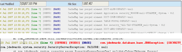 The second segment of the log file viewer is the log file. Results are color-coded and displayed in pages. EnterpriseOne log files are color coded for improved readability. The last date modified and file size information appears in the Last Modified and File Size fields.