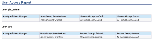 Use this report to verify that you have added users to the appropriate user groups and that you have applied the appropriate permissions to each user group.