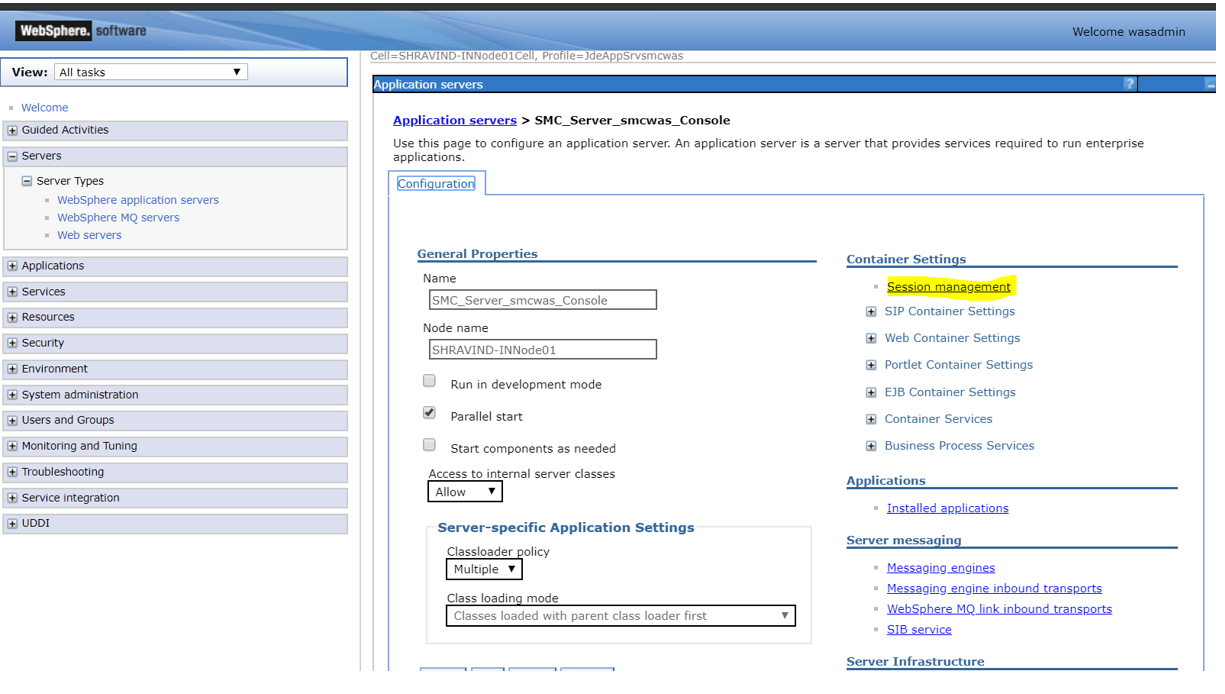Navigate back to the J2EE container in which the Server Manager Console is running and expand the Ports option and note down the port number for the WC_defaulthost_secure name.