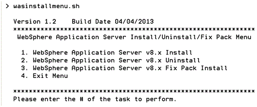 On WebSphere Application Server Install/Uninstall/Fix Pack Menu, enter the number of the task to perform.