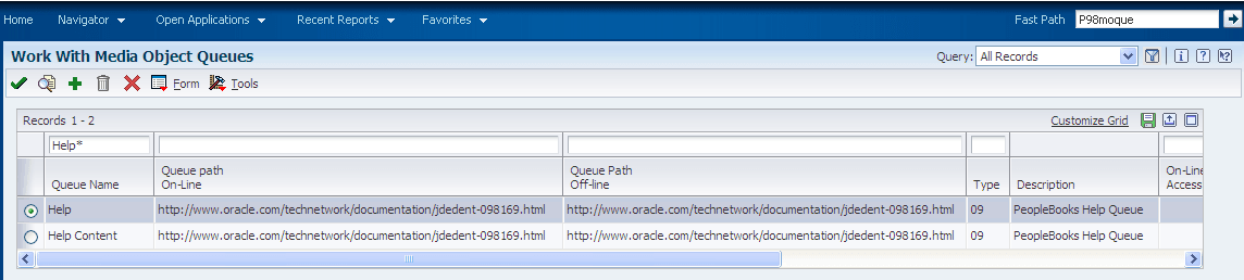 Enter the value 09. The Type field description changes to PeopleBooks Help Queue.