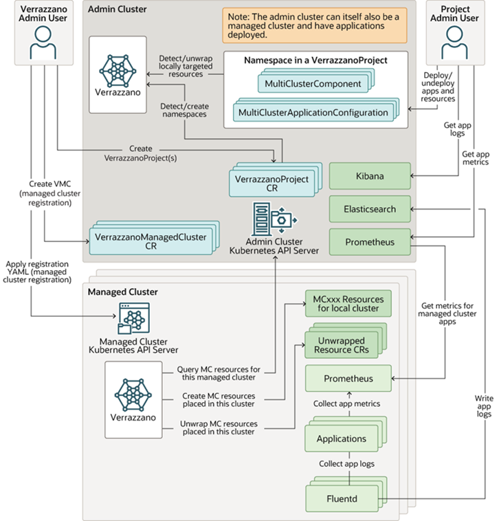 - A Verrazzano multicluster Kubernetes resource, created on the admin cluster, will be retrieved and deployed to a