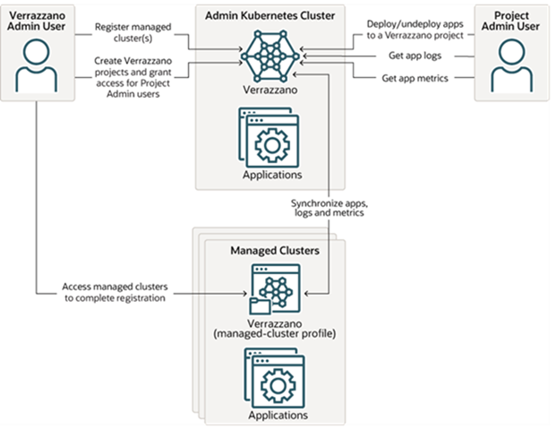 - The admin cluster is a central point from which Verrazzano applications in managed clusters can be deployed and monitored.