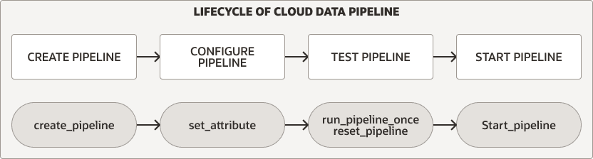 The DBMS_CLOUD_PIPELINE package provides procedures for creating, configuring, testing, and starting a pipeline. The pipeline lifecycle and procedures are the same for both load and export pipelines.