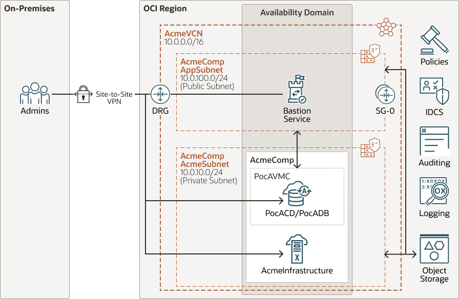 One VCN to provide network connectivity to all dedicated infrastructure resources. This VCN will connect to the Acme Company VPN using an IPSec VPN and have an Internet Gateway resource that blocks all incoming internet traffic. It will be named AcmeVCN.
