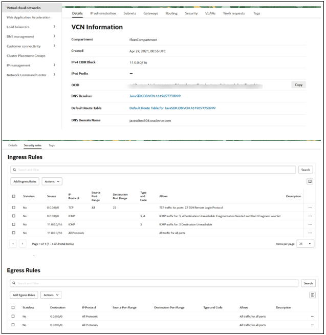 in VCN-Network:ADBD VCN allow all-endpoints to connect to Db-Client:ADBDClient endpoints with protocol='tcp/22' in VCN-Network:ADBD VCN allow Db-Client:ADBDClient endpoints to connect to Db-Server:ADBDServer endpoints with protocol='tcp/1521' in VCN-Network:ADBD VCN allow all-endpoints to connect to Db-Server:ADBDServer endpoints with protocol='tcp/2484' in VCN-Network:ADBD VCN allow all-endpoints to connect to Db-Server:ADBDServer endpoints with protocol='tcp/22' in VCN-Network:ADBD VCN allow all-endpoints to connect to Db-Server:ADBDServer endpoints with protocol='tcp/1521' in VCN-Network:ADBD VCN allow Db-Server:ADBDServer endpoints to connect to all-endpoints in VCN-Network:ADBD VCN allow all-endpoints to connect to Db-Server:ADBDServer endpoints with protocol='icmp' in VCN-Network:ADBD VCN allow Db-Server:ADBDServer endpoints to connect to 'osn-services-ip-addresses' with protocol='tcp/443' -