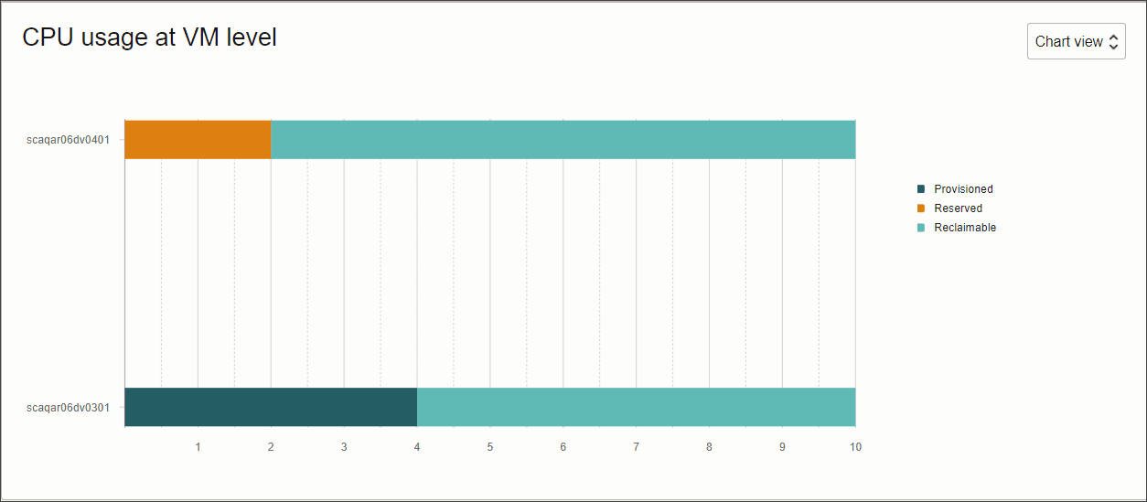 Chart view is the default view. In this view, you can see a horizontal bar graph giving a break-down of the CPUs used by this ACD in each VM. Each bar shows the number of provisioned, reserved, and reclaimable CPUs for that VM with color-coding. Hovering on each colored part of the horizontal bar displays the number of provisioned, reserved, and reclaimable CPUs for that specific VM.