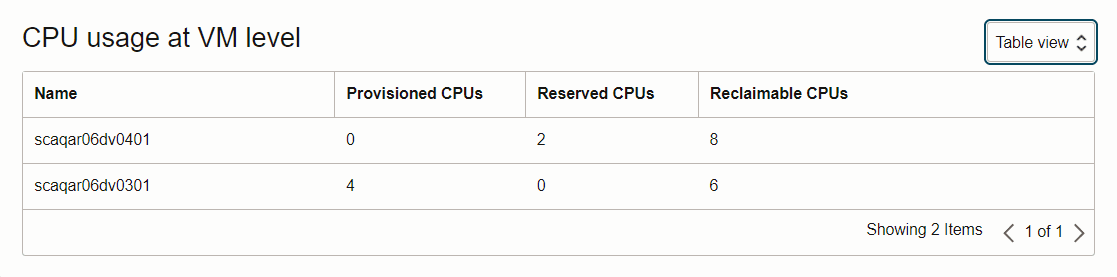 To see the resource usage details of an ACD in table view, select Table View from the drop-down list at the top-right corner of the CPU usage at VM level section. The table view shows the exact same details as the chart view, in the form of a table. It lists the number of provisioned, reserved, and reclaimable CPUs for each VM allocated to the ACD from the parent VM cluster.