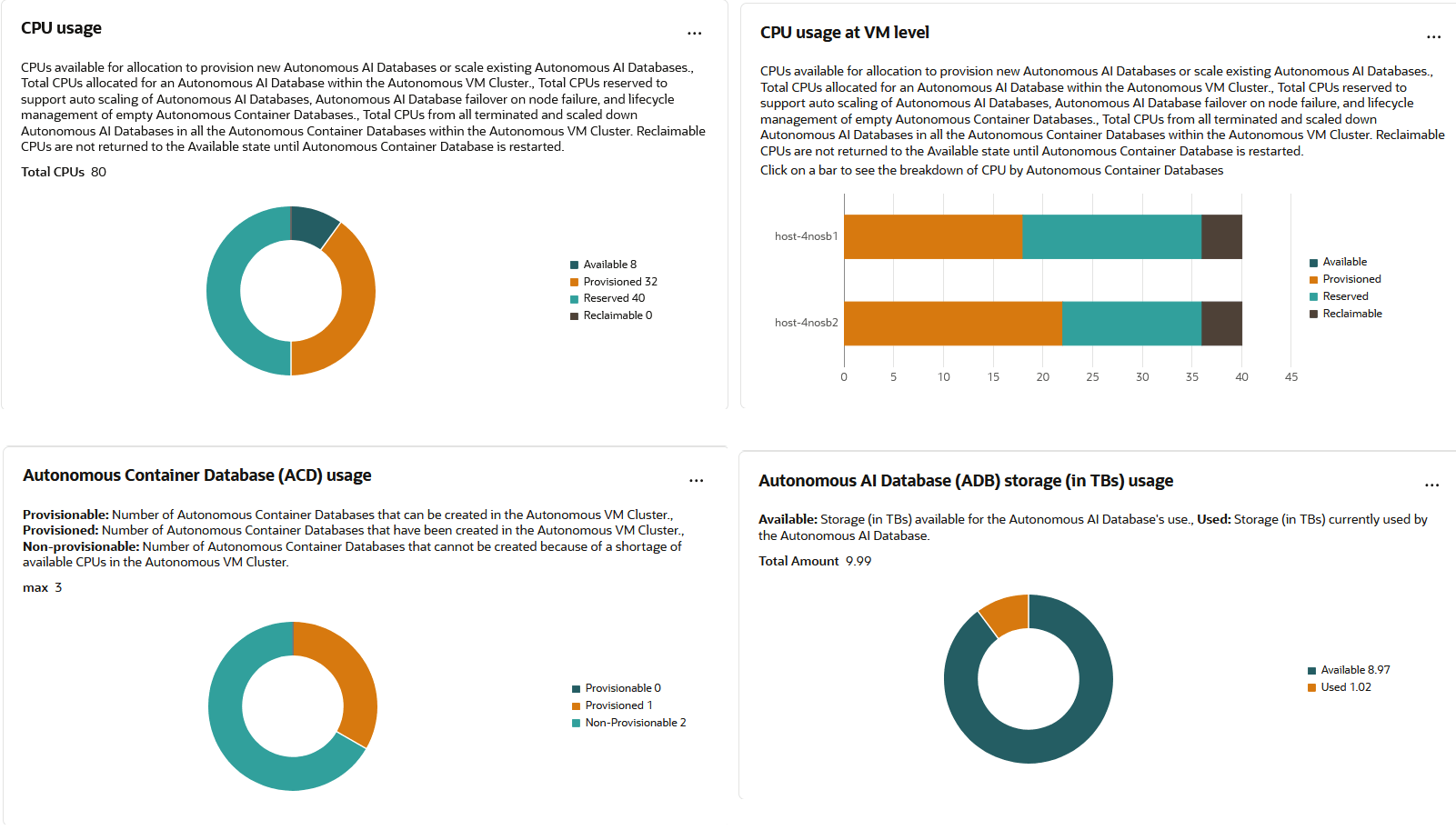 Autonomous Container Database (ACD) usage: Depicts the Total number of ACDs that can be created in this AVMC along with a break-up of Provisionable ACDs, Provisioned ACDs, and Non-provisionable ACDs. Please see Resource Terminology to understand what each of these mean. This is a doughnut-chart with the total number of ACDs shown in the center of the chart.