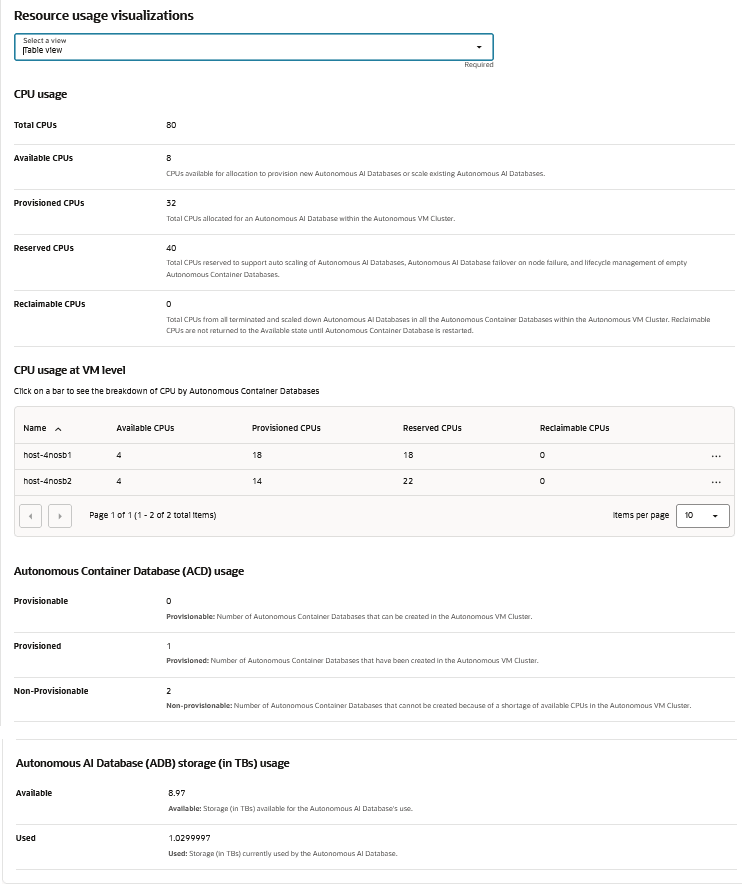 Available Storage (in TBs): Storage available for Autonomous AI Databases’ use in an Autonomous Exadata VM Cluster (AVMC).