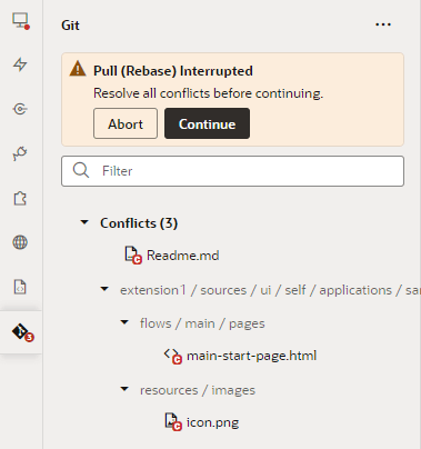 When a file contains conflicts, you can use its context menu in the Git panel to quickly resolve conflicts. You do this when the file has just a few simple conflicts that you can easily resolve by keeping your branch's changes or the other branch's changes.