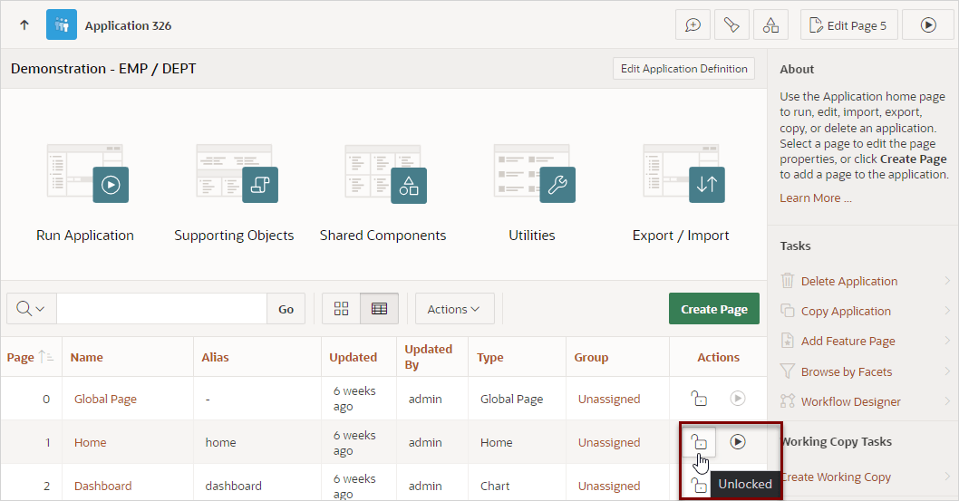 Unlock a page from the Application Home page. - Unlocking a Page in Page Designer