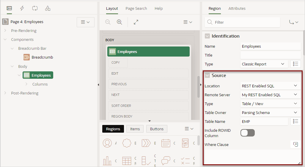 Before configuring a component to use a REST Enabled SQL service reference, , you must complete the tasks described in Before You Begin: REST Enabled SQL Service Requirements and create the reference as described in Creating a REST Enabled SQL Service Reference.The following examples demonstrate how to configure the Source attributes for an existing Classic report and chart to point to a remote database using a REST Enabled SQL service reference named My REST Enabled SQL.