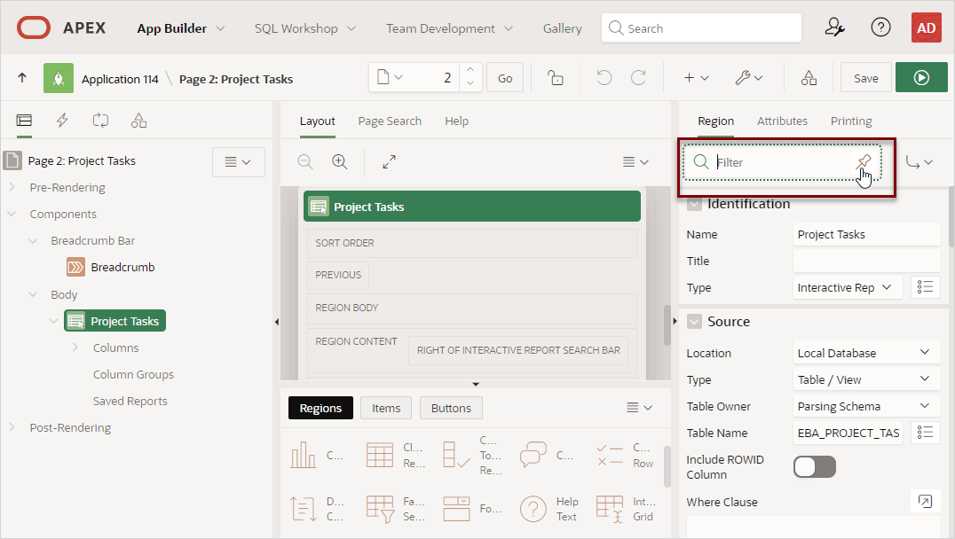 Click the Pin Filter button on the right side of the search field to search across different items, regions, and processes. You can “pin” keywords to have them persist as you click around Page Designer. To “unpin” the search, click the Pin Filter button again.