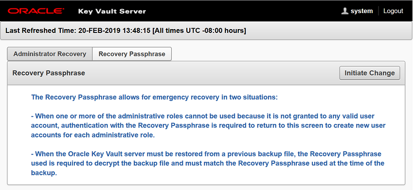 In an emergency when no administrative users are available, or you must change the password of administrative users, you can recover the system with the recovery passphrase that was created during Oracle Key Vault installation. In addition, you can change the recovery passphrase to keep up with security best practices.