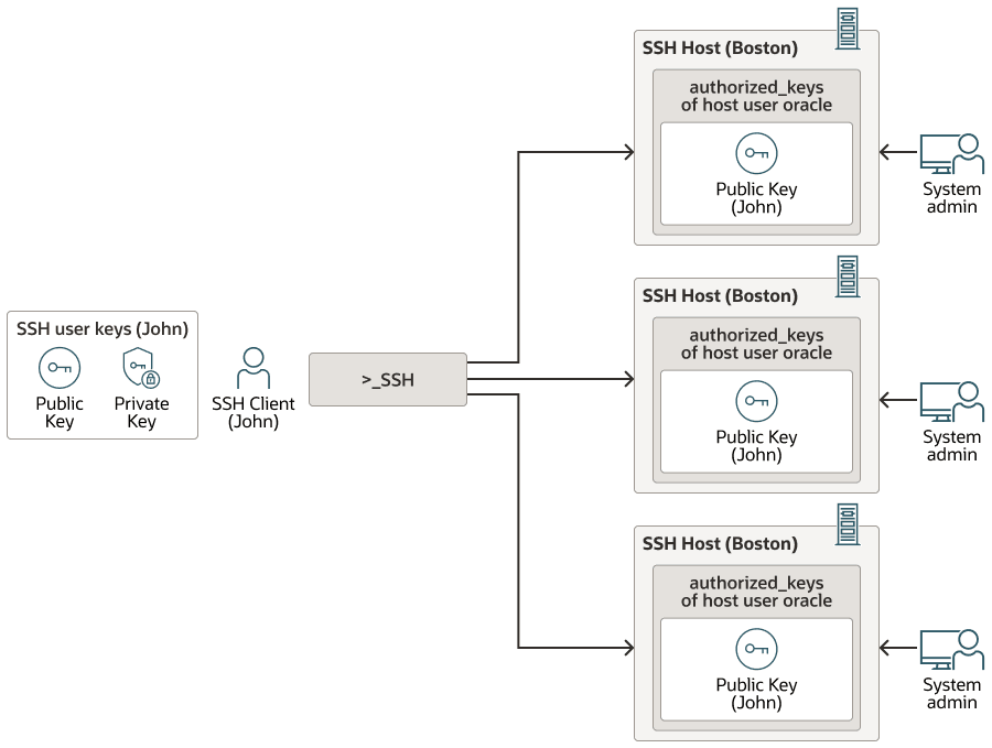 The Centralized-SSH-Key-Management figure illustrates the SSH key and access control management, John initiates the connection to phoenix as SSH server host user Oracle.