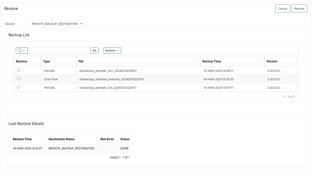 LOCALare useful to save a current state of Oracle Key Vault. Because these backups are stored on disk, they could be lost in the case of hardware or other catastrophic failure. They will also not be available after a failover or switchover in a primary-standby configuration. You cannot restore the backups to a primary-standby without first unpairing the primary from the standby, nor can you restore the backups to a cluster configuration. Therefore, you should back up the data to a remote destination when using these configurations.A